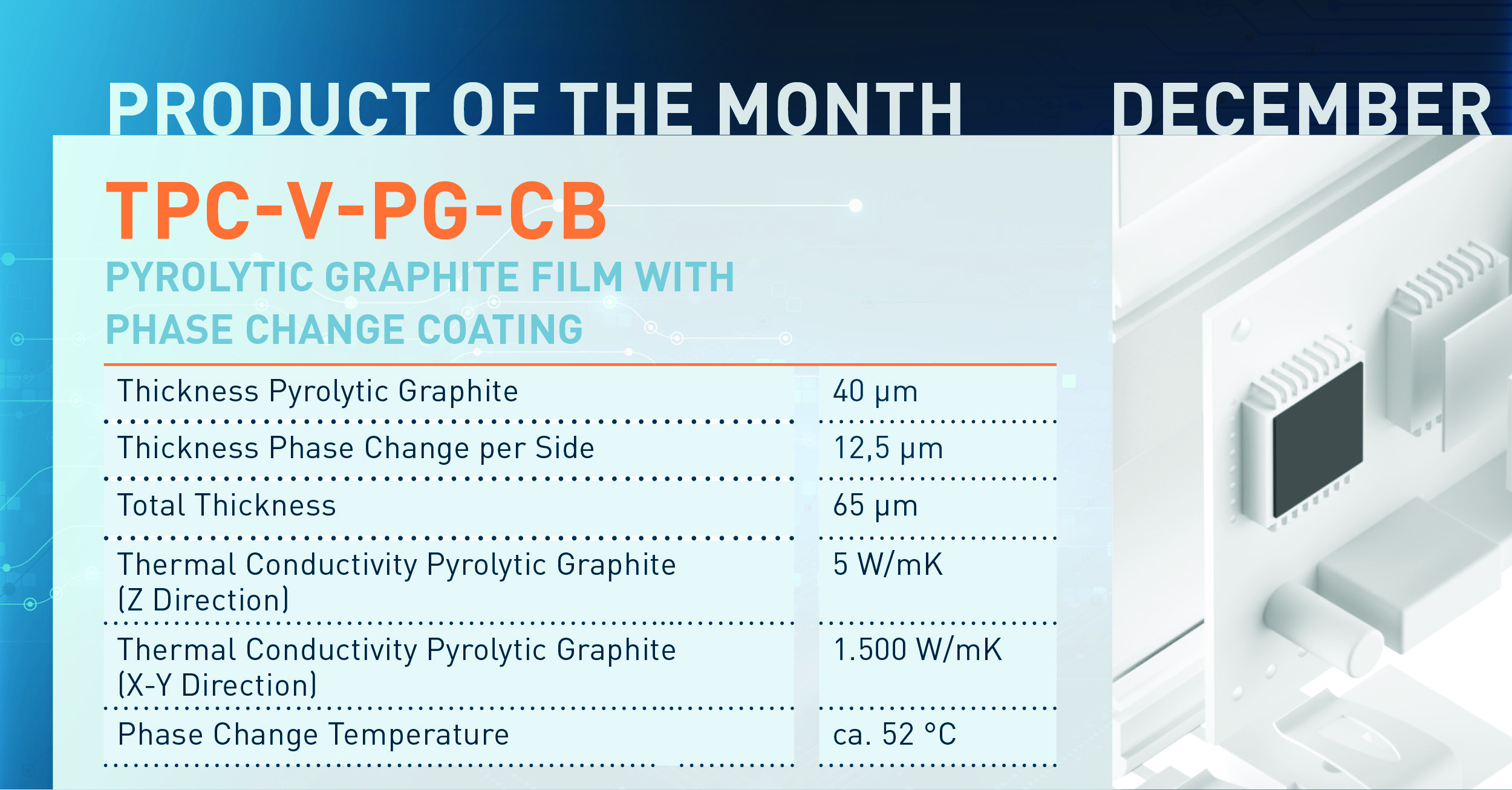 You’ve got an application, where hot spots require even spreading of heat in all directions and optimize thermal contact? Then our new „Product of the Month“ might be the optimal solution for you! The Pyrolytic Graphite Film TPC-V-PG-CB coated with phase change has much more efficient heat spreading capability than comparable films made of copper, aluminum or polyimide. The Phase Change Coating also maximizes the thermal 2-side performance of the film.